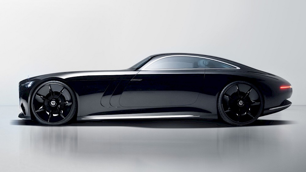 Na první pohled zaujme dramatická silueta s extrémně protáhlou kapotou, lehce taženou zádí a hlubokou, lesklou černou karoserií. Designéři se nechali inspirovat reprízami legendárních modelů — proporce a tvar blatníků připomínají vozy jako 540 K Autobahn-Kurier nebo 300 SL. Upravený, moderní výklad těchto forem doplňuje nová maska chladiče — vysoká, vertikální, obrovská a vybavená LED osvětlením i digitálními prvky.
