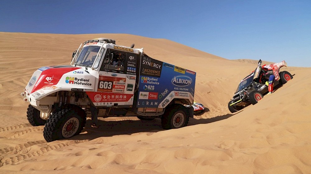 Záchranářská mise závodníka Buggyry se odehrála 30 kilometrů před cílem. Martin Prokop zůstal zapadlý v díře mezi dunami a nedařilo se mu jeho Ford Raptor nastartovat. „Vytáhli jsme ho, pak jsme mu auto roztáhli a tím nastartovali. Takže jsme s tím chvíli kočovali po dunách a pak jsme už dojeli v pohodě do cíle,“ dodává Šoltys.