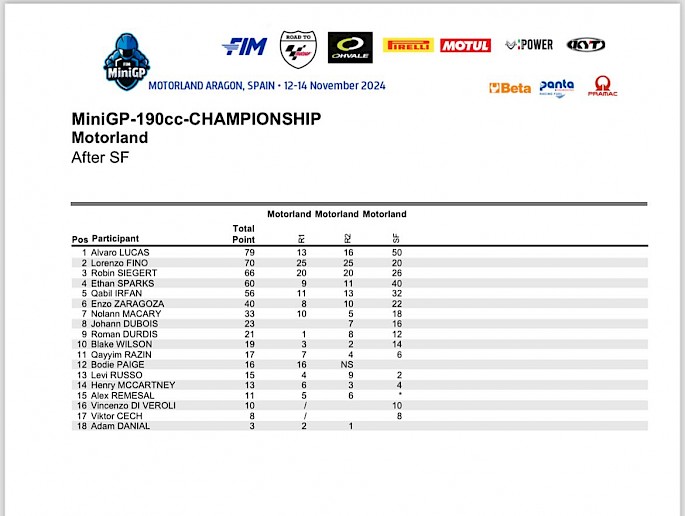 Lorenzo Fino vstoupí do superfinále s desetibodovým náskokem před Robinem Siegertem. Álvaro Lucas se nachází na třetí pozici se ztrátou 21 bodů. Roman Durdis je dvanáctý, Viktor Čech sedmnáctý.